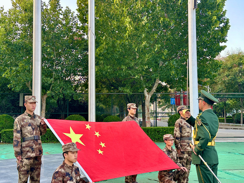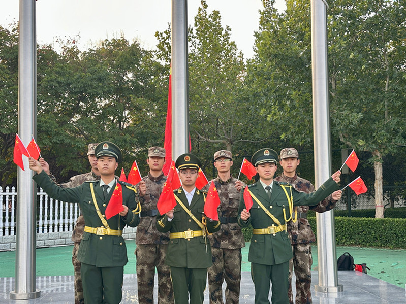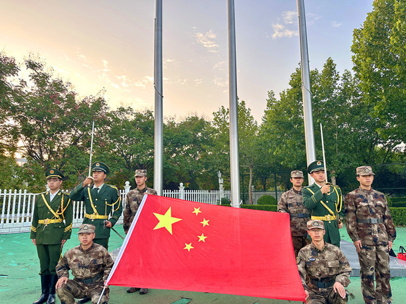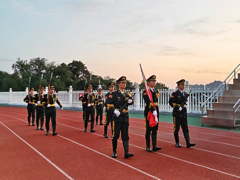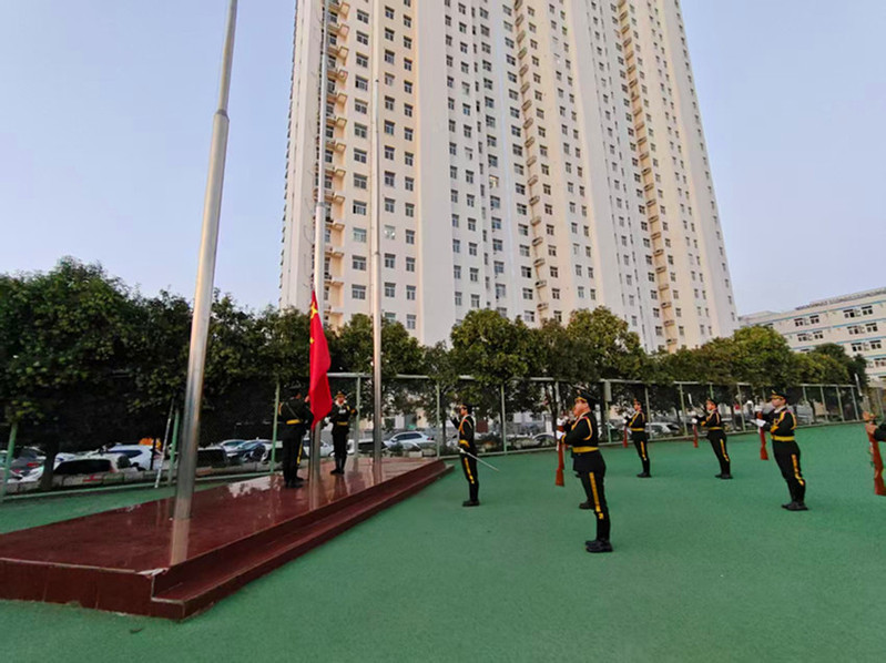 9月30日清晨,在第十二个国家烈士纪念日这个特殊时刻,护校队举行庄严升旗仪式。队员们身着制服,迈着铿锵步伐护送国旗入场。当雄壮的国歌奏响,鲜艳的五星红旗迎着朝阳冉冉升起,全体队员面向国旗行注目礼,既表达对革命先烈的深切缅怀,更以昂扬姿态向祖国76华诞致以崇高敬意。