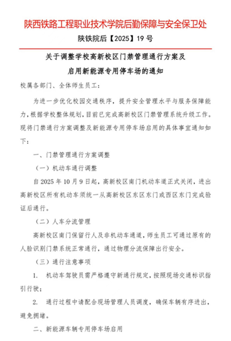 关于调整学校高新校区门禁管理通行方案及启用新能源专用停车场的通知 |