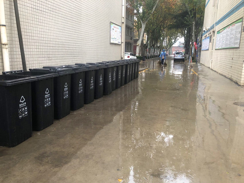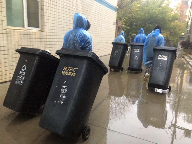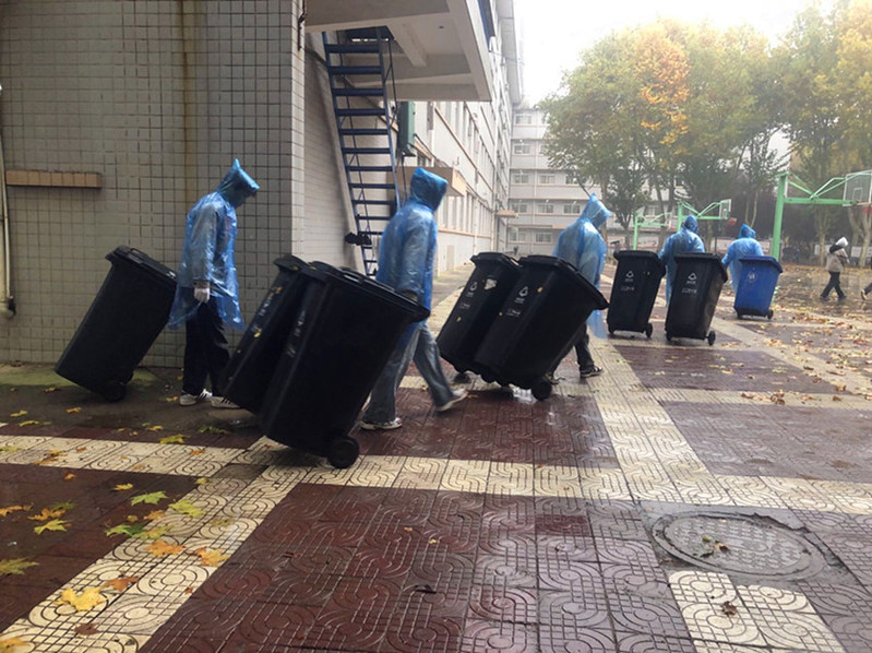 在校园垃圾清运区域,学生们身着统一的蓝色雨衣,分工明确、通力协作。有人负责将散落的垃圾袋装填入大型垃圾桶,有人整理清运工具,大家有条不紊,即便地面湿滑、行动不便,仍高效完成了垃圾清理任务,确保校园无垃圾堆积,维护了环境的干净与卫生。