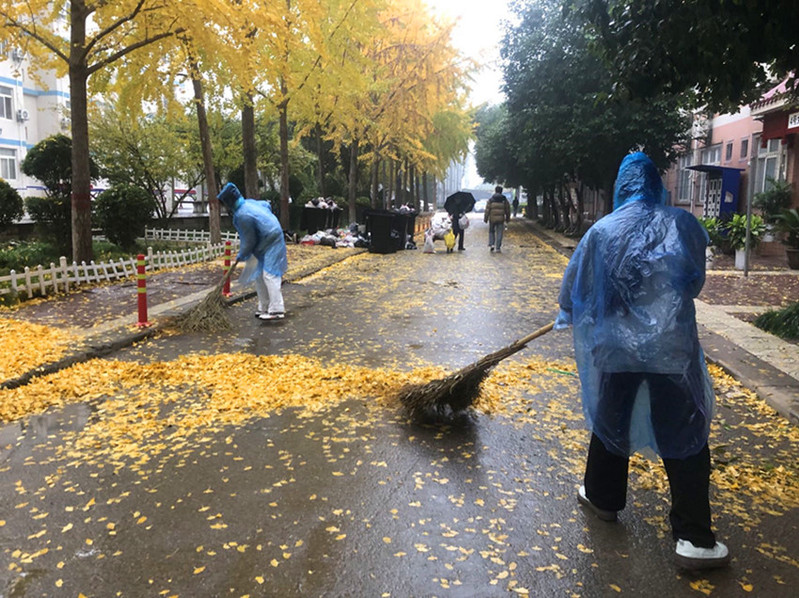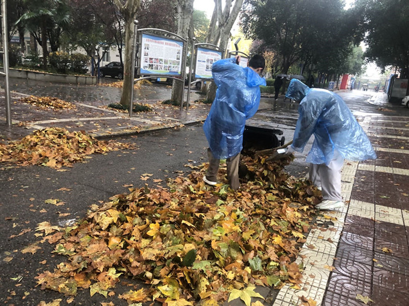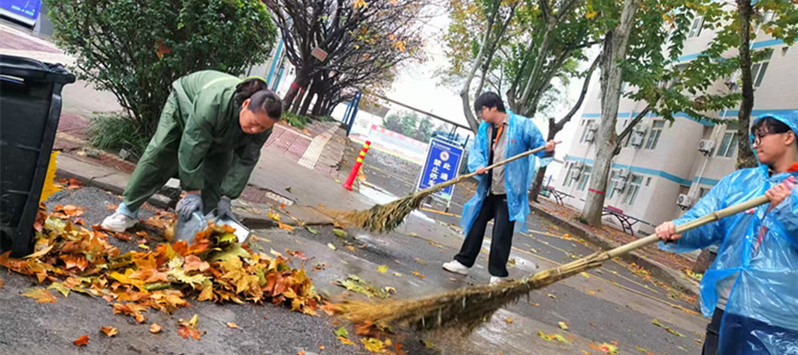 与此同时,校园道路两旁,金黄的落叶被雨水打湿,铺满路面。劳动班学生手执扫帚,俯身挥帚,冒雨清扫各主干道与广场区域的落叶。他们细致地将散落的黄叶与枯枝归拢集中,纵然雨水浸湿衣裤,也未有丝毫懈怠,不遗漏任何一个角落。经过一番努力,雨中的陕铁院临渭校区道路恢复了往日的整洁与通畅。